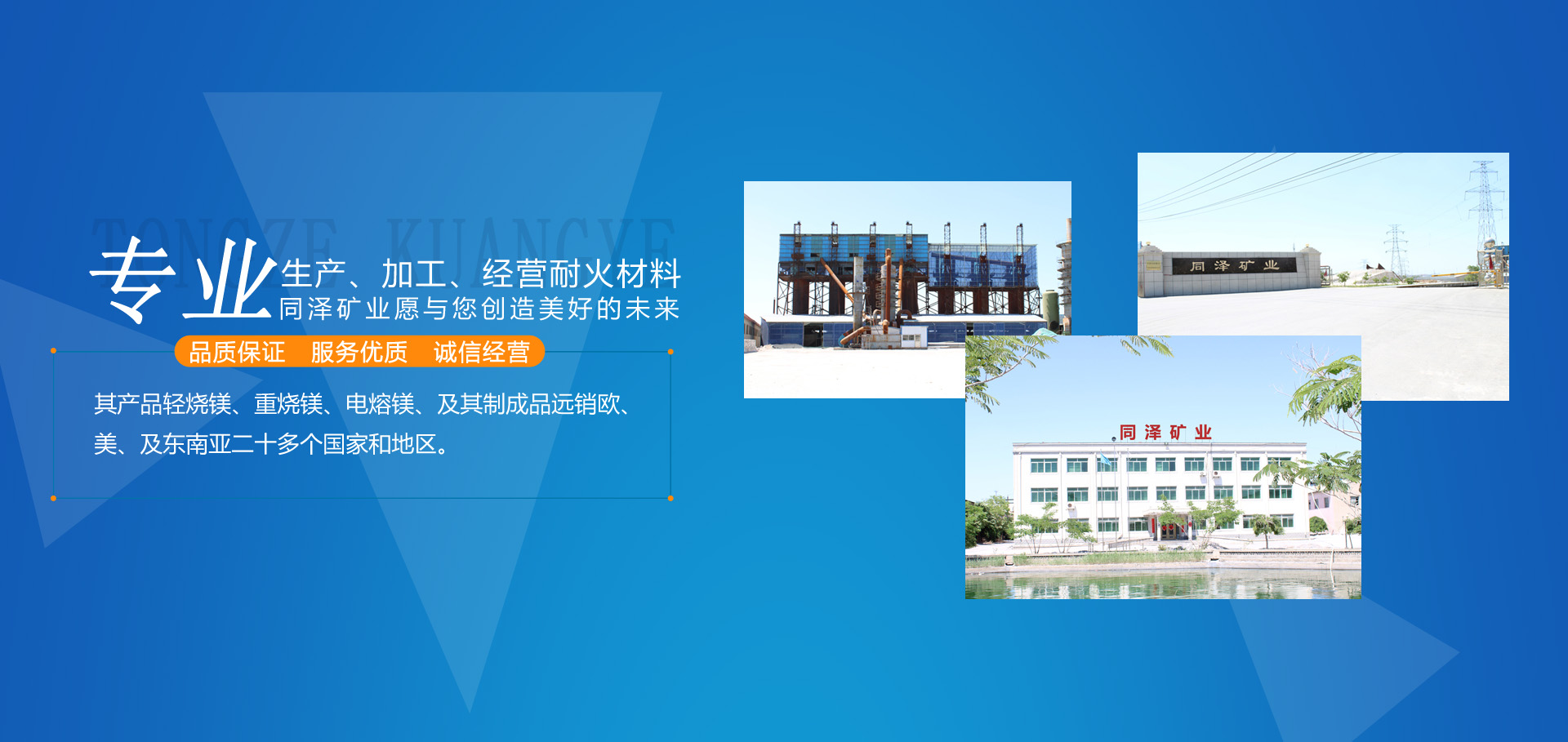 大石橋市同澤礦業(yè)有限公司,是以生產(chǎn)、加工、經(jīng)營各種耐火材料為主的綜合性經(jīng)濟實體。其產(chǎn)品輕燒鎂、重燒鎂、電熔鎂、及其制成品遠銷歐、美、及東南亞二十多個國家和地區(qū)。